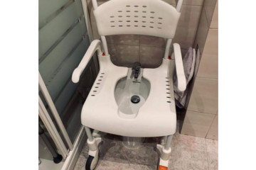 Silla de ruedas para ducha y wc marca etac clen. Asiento de 55cm de ancho. Fácil y comida de usar. Los apoyabrazos se pueden quitar. Equipada con 4 ruedas con freno para una flexibilidad completa. Apertura en la parte trasera en vez de la delantera para una completa higiene.