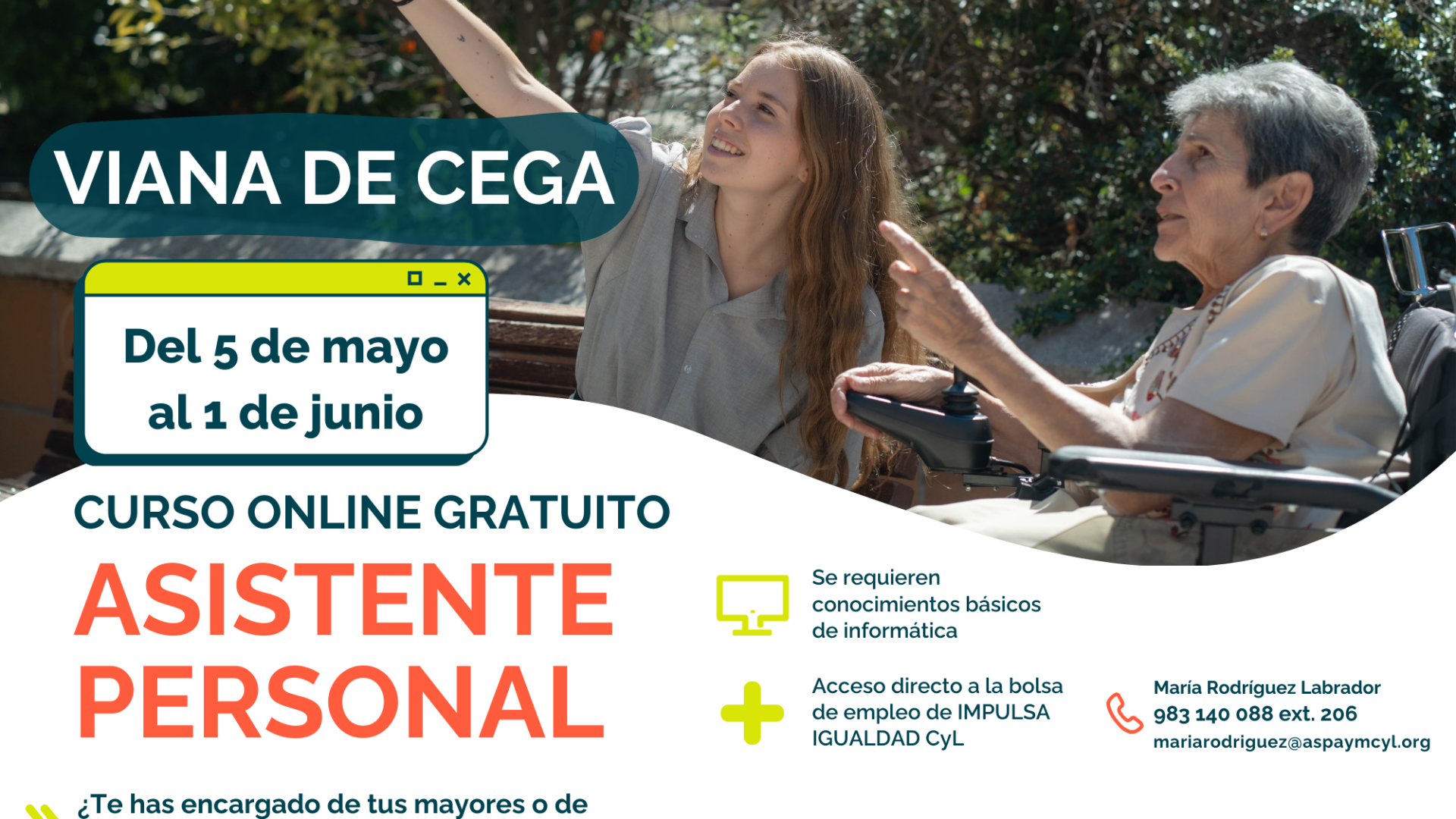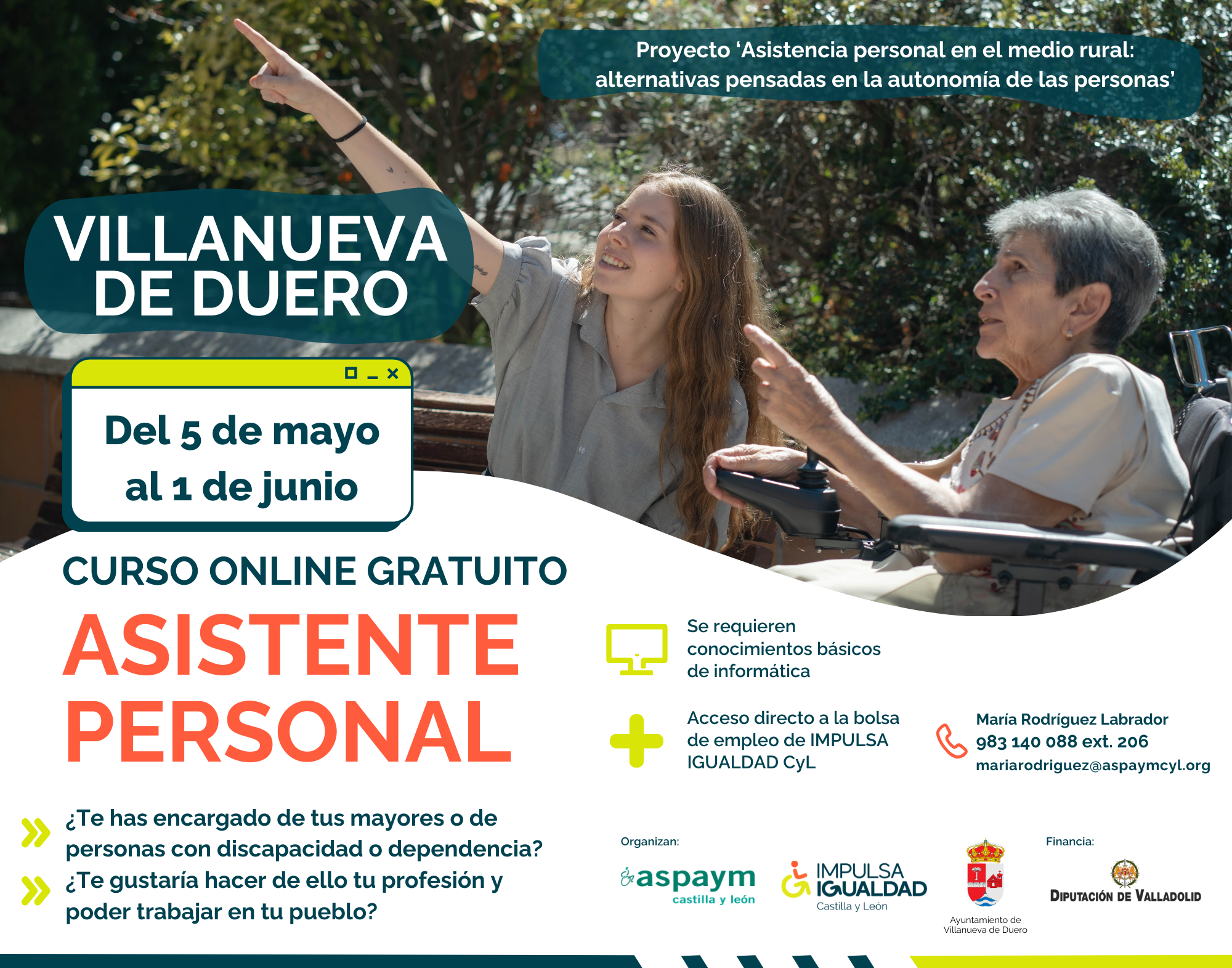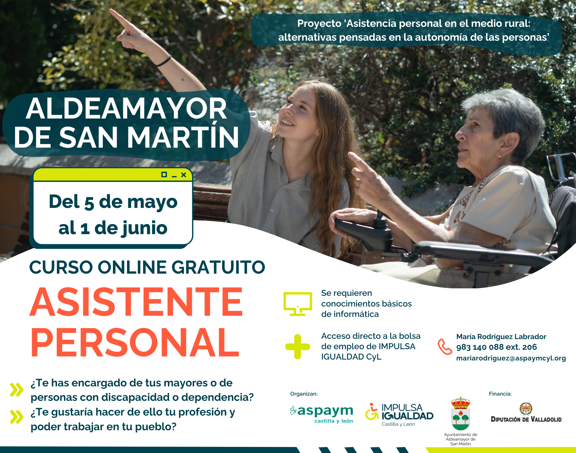 ASPAYM Castilla y León refuerza su compromiso con el empleo en el medio rural a través de la formación en asistencia personal. Entre el 5 de mayo y el 1 de junio, se desarrollarán nuevos cursos gratuitos en los municipios de Aldeamayor de San Martín, Viana de Cega y Villanueva de Duero, dirigidos a personas interesadas en formarse en una profesión con alta demanda y fuerte impacto social.