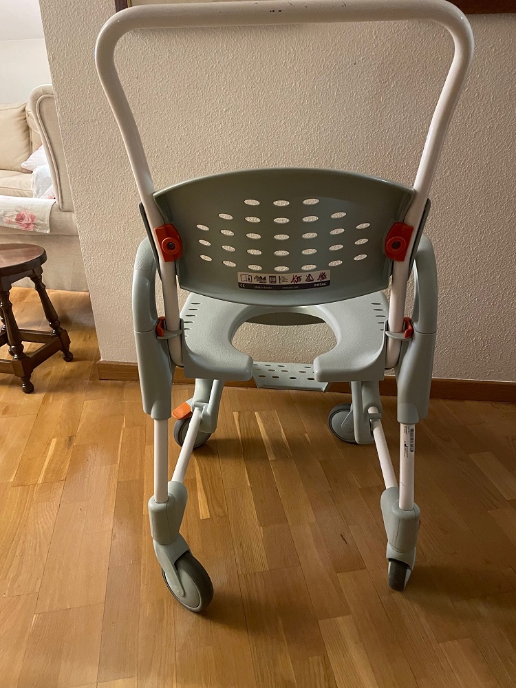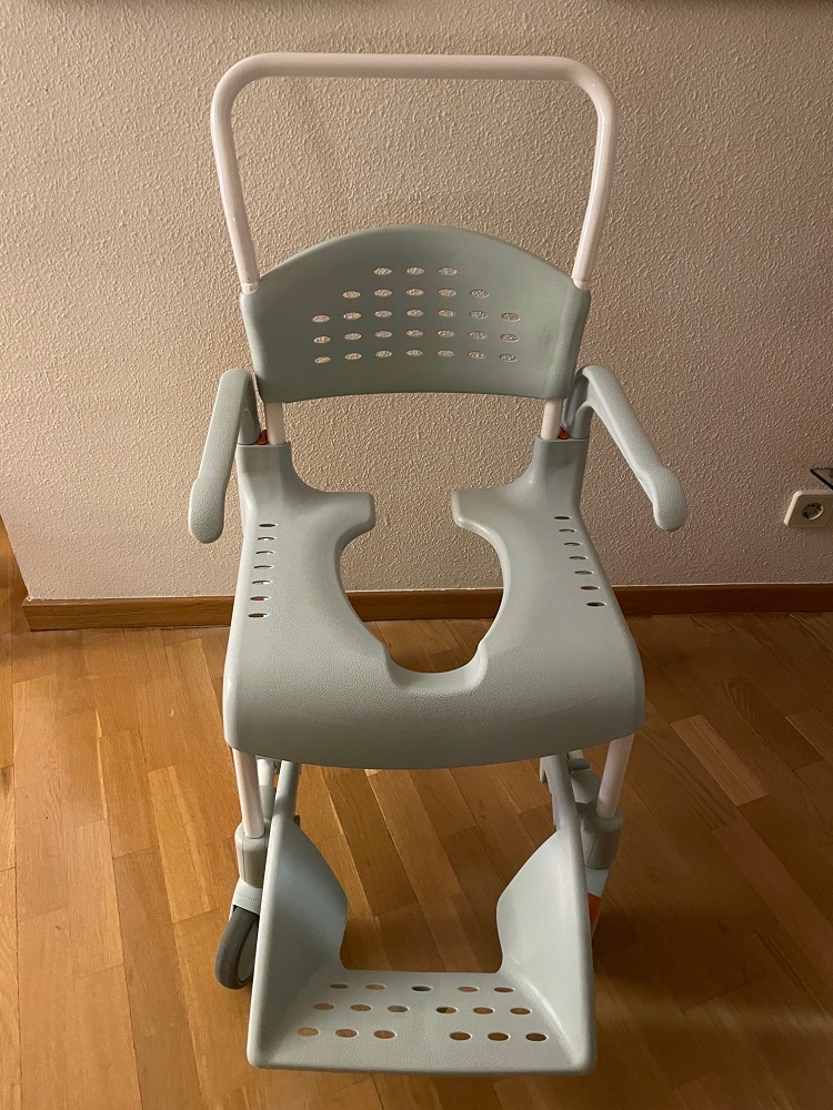 Silla de baño con reposapiés, reposabrazos y con ruedas. Perfecta para duchas y transporte en el domicilio.